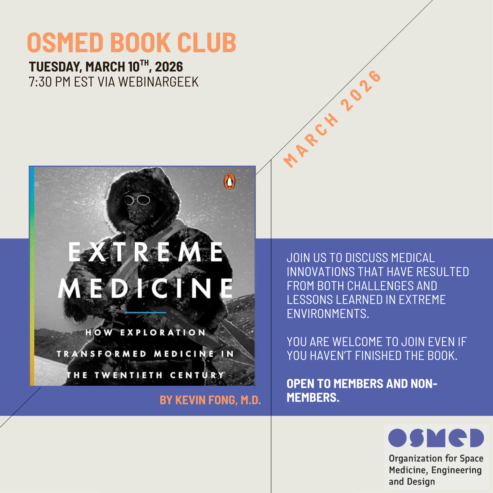 Join us for a dynamic Book Club discussion of Extreme Medicine: How Exploration Transformed Medicine in the Twentieth Century by Dr. Kevin Fong as we explore how breakthroughs born in the Arctic, on battlefields, underwater, and in space reshaped modern medicine and expanded the limits of human survival. Open to members and non-members alike, this conversation will examine how extreme environments drive innovation in trauma care, surgery, critical care, and space medicine, and you are welcome to attend even if you have not finished the book.