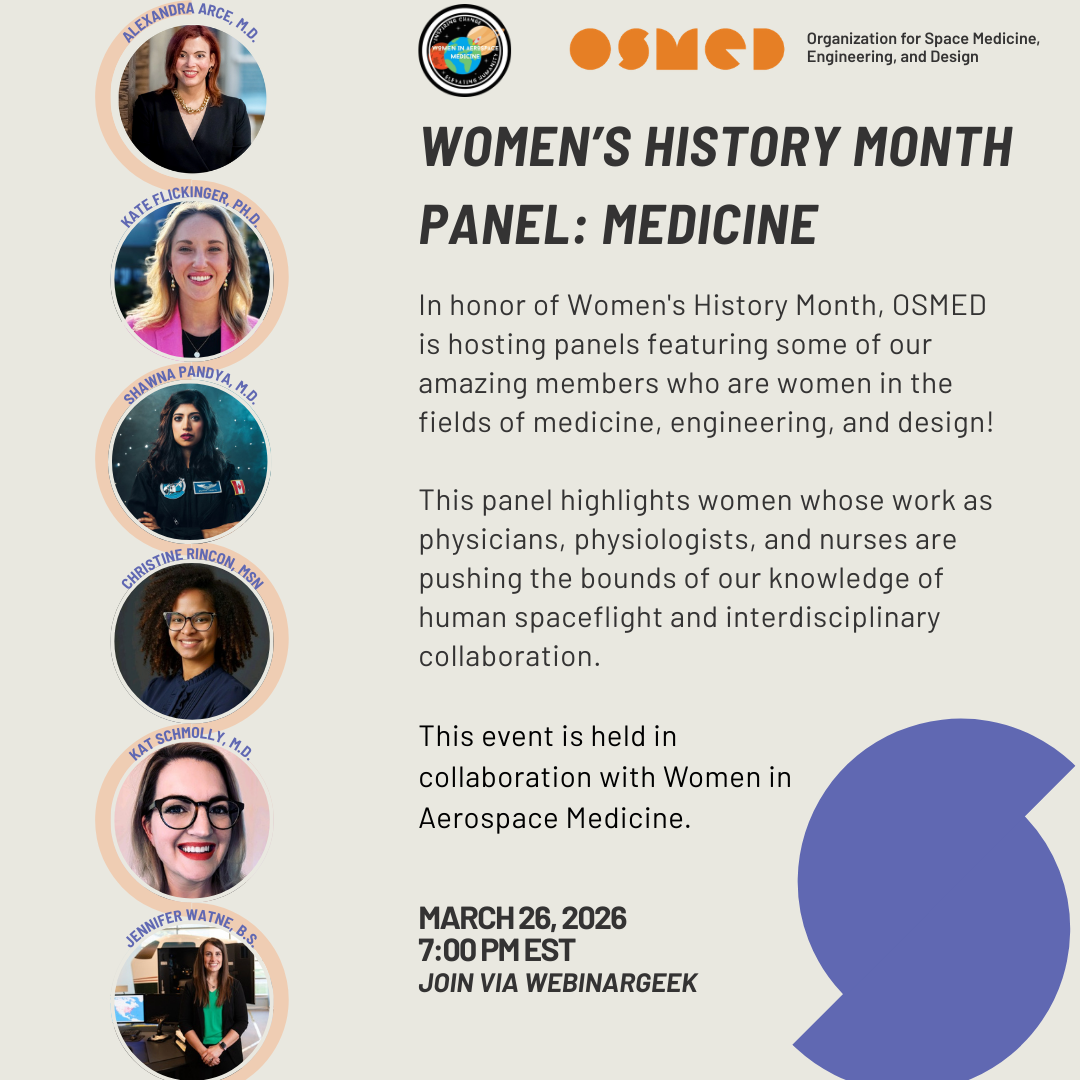 In honor of Women's History Month, OSMED is hosting a panel featuring some of our amazing members who are women in the fields of medicine, engineering, and design! This panel highlights women whose work as physicians, physiologists, and nurses are pushing the bounds of our knowledge of human spaceflight and interdisciplinary collaboration. This event is held in collaboration with Women in Aerospace Medicine. Come prepared with Q&A for these incredible speakers!